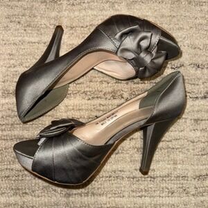 Great Condtion. Maribelle Peep Toe Heel from David's Bridal. Some light discoloration on tips of heels. Silver/Gray color with Bow detail. Slight platform, women's size 7.