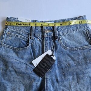 Made from 100% cotton, this high-rise pair features distressed and embellished rhinestone detail. Wear them with a crop top and heels.