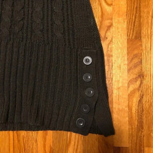 Grey cowl neck with cap sleeves sweater, in good used condition. Cable pattern on the front with decorative buttons on the bottom. Size large
