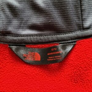 North Face hooded sweatshirt. Pull over with a kangaroo pouch. Red with a black logo on the chest. Drawstring at the neck. It is marked a size medium. 100% polyester. There are not any stains, tears, or holes. Very good, gently used condition.