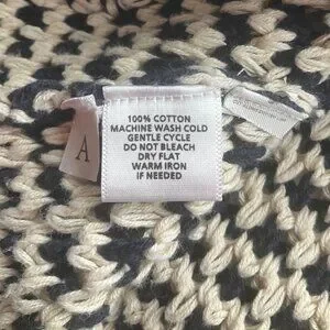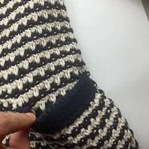 Lightweight and breathable chunky knit cardigan, ideal for layering. Features a navy and cream striped pattern, two front pockets, and long sleeves. Very good condition, Material Cotton, Tag says Large but according to measurements fits Medium