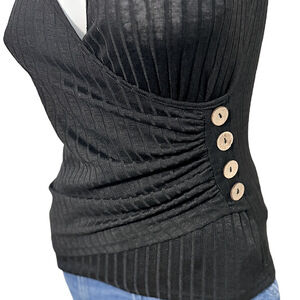 Black ruched ribbed sleeveless deep v-neck tank top with wood buttons casual business casual small tops