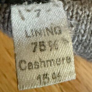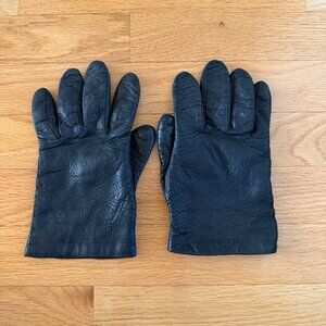 SIM Italian Gloves Leather and Cashmere Lined. Black leather with gray lining. Genuine leather, Made in Italy. Lining is 75% cashmere, 15% wool, 10% silk. Gloves are approximately 8" long from the tip of the middle finger to the edge of the wrist. Good pre-owned condition. Fingers are creased. See the last picture.Tags are dirty and pilled. Size 7.