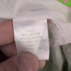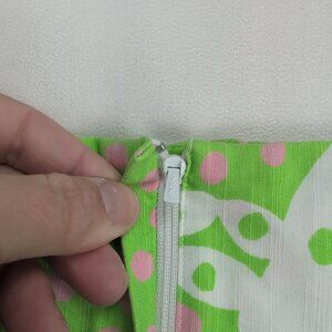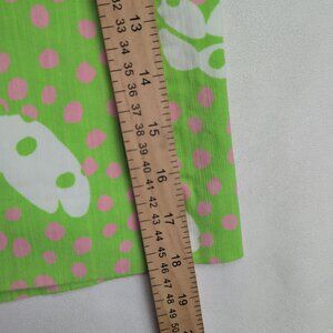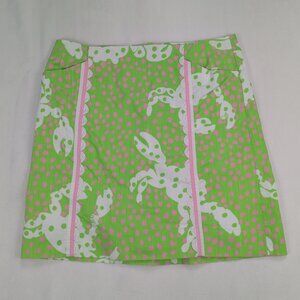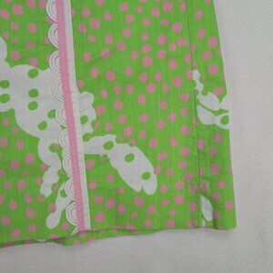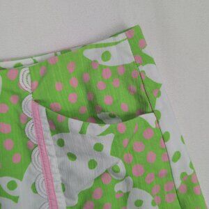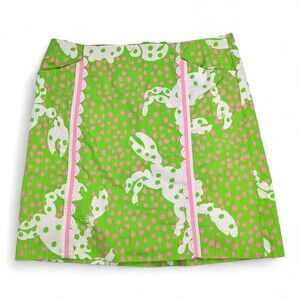 Excellent used Lilly Pulitzer midi skirt in size 6. Vibrant lime-green background with pink polka dots and a whimsical white animal-inspired motif. Features vertical pink piping with scalloped white trim panels for a playful, preppy look. A-line midi silhouette perfect for resort, spring, or summertime outfits. In excellent used condition with no major rips, tears, stains, or flaws; typical gentle wear may be present. See photos for pattern, color, and detail.