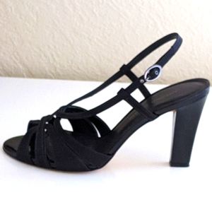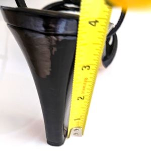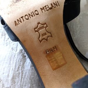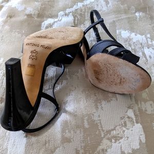 Antonio Melani Strappy Open Toe High Heels Slip-on mat black 🖤 Satine with patent leather 4" heels sandals. Shoes have an adjustable strap with buckle closure, lightly cushioned insole, leather sole and they're great 👍 condition, wear once to the wedding. They are fantastic for upcoming holidays for Thanksgiving Day, Christmas or New Years parties. The sandals are size 8 1/5M.