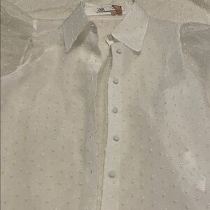 Zara white sheer polka dot organza blouse with puffed sleeves and a collar. It is described as a "Swiss dot" organza blouse and so beautiful when worn. The blouse features sheer, voluminous puff sleeves with a textured polka dot (or Swiss dot) pattern, a collared neckline, and a button-down front closure. The front of the blouse is lined but sheer (see through) as well as back and sleeves. This has been dry cleaned.