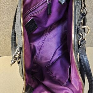 Chic and versatile Coach satchel. Features a textured black design. Ideal for everyday elegance. I inherited this bag from a family member but rarely use it. It's incredibly roomy and in super condition (see photos). Please not the square stitching around the leather authenticity tag inside the bag (see photo).