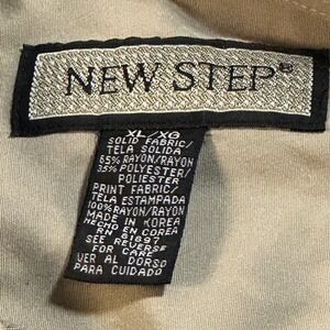 NEW STEP mens long sleeve button up shirt in khaki. Features a unique geometric print on the front panel and solid khaki sleeves and back. Classic collar and button front closure.