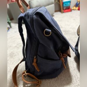 This stylish backpack diaper bag features a sleek navy design with a contrasting brown accent. Perfect for daily use, it combines functionality with a modern look. Used for 7-8 months with 1 kid. Comes with a small detachable purse which was never used.