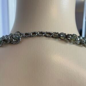 Gorgeous silvery gray iridescent beads are woven together into a beautiful choker that reminds me of Victorian times or a steampunk look. Measures approx 15" long and is adjustable with several closure loop options. This would be great in any setting, from paired with a white t-shirt and jeans, to matched with a silk, velvet, or beaded gown for a formal event, wedding, or holiday party.