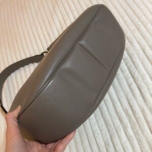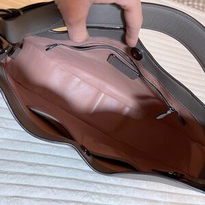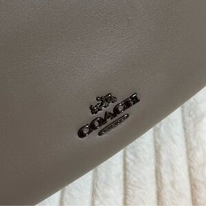 Chic taupe/deep gray (dog) leather hobo bag by Coach. Sleek design with detachable strap. Lovely soft leather inside and out with striking and bold black hardware and accents. Like new condition with very little signs of use as it was hardly carried. Slight signs to some of the leather if you are looking for it (refer closely to the photos provided) but all in all could basically pass as new, IMO. Comes from a smoke free home. Please refer to all of the photos provided before purchase to be sure of the details, condition and measurements. Does come with a crossbody strap. One zip and two slip interior pockets. Sufficient handle drop length to easily and comfortably carry over the shoulder. Classy, authentic and luxurious.