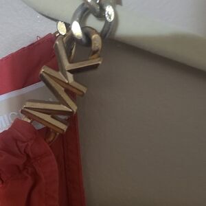 Elegant coral halter dress. Features gold chain straps. Perfect for any occasion.