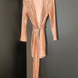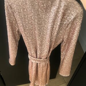 NBDxNAVEN rose gold/pink sequined, tie in front dress, long sleeve, midi dress, low V neck, soft inside