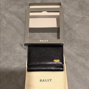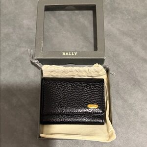 Elegant Bally card holder in textured black leather. Features a refined gold detail. Ideal for stylish card organization.