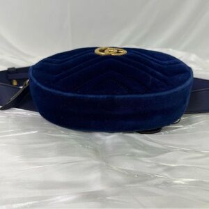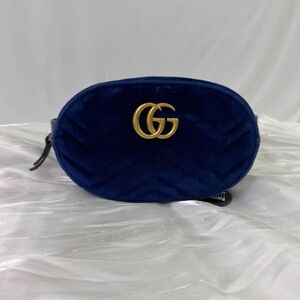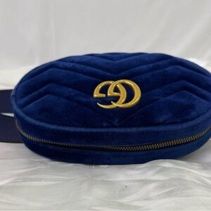 Luxurious navy velvet belt bag by Gucci. Features iconic gold logo. Perfect for stylish outings.