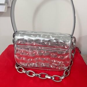 Stylish Diesel crossbody bag in metallic silver. Features a bold chain strap and textured design. Perfect for adding flair to any outfit.
