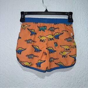 This is a pair of adorable children's swim shorts, perfect for a fun day at the beach or pool! The vibrant orange background is covered in a playful print of various dinosaurs in shades of blue and yellow, making them highly appealing to young dino enthusiasts. The shorts feature a comfortable blue elastic waistband with a white drawstring for an adjustable and secure fit. The hem is also trimmed in a matching blue, providing a neat finish. The inner lining appears to be a light-colored mesh, typical for swimwear, ensuring breathability and quick drying. A tag from the brand "maomgic" indicates a size of 5/6, suitable for young children. On the back, there's a small, functional pocket for storing tiny treasures.