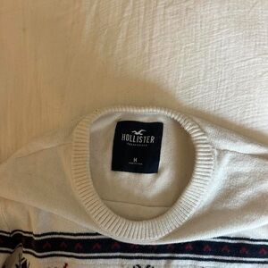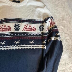 Hollister Co. knit sweater featuring a classic navy, white, and red colorway. Love the fair isle snowflake detailing and the archival script logo across the chest. Perfect for that