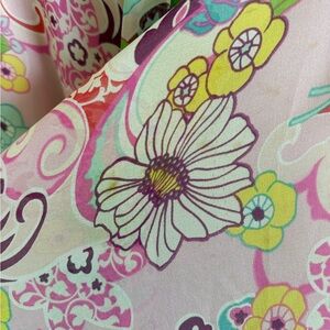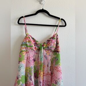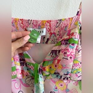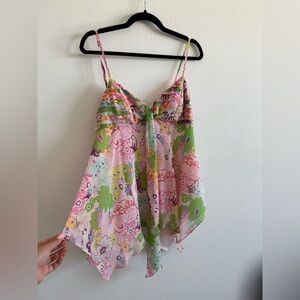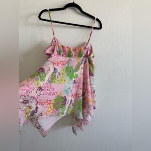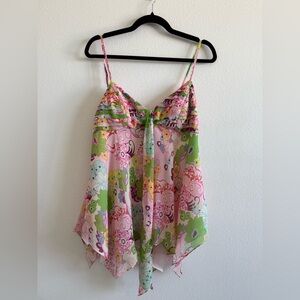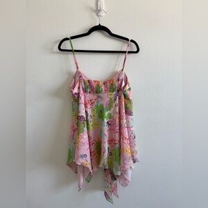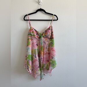 Unique vintage one of a kind SUE WONG Pink and green floral cami top with tie front detail, outer shell is 100% silk and lined with polyester