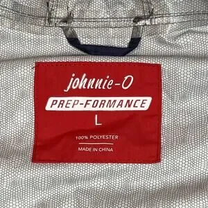 Style/Model details: Interior red johnnie-O PREP-FORMANCE neck label with size L, interior care tag with RN# 124927, subtle printed interior lining pattern, and small rubberized surfer-and-board logo patch at left chest.