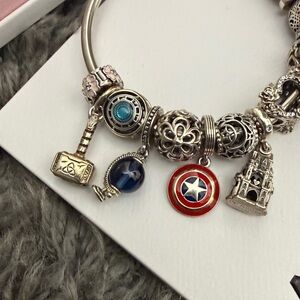 Elegant Pandora bracelet featuring silver charms. Includes red and blue accents. Perfect for any occasion.