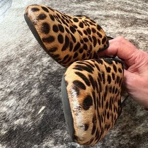 Birdies Starling Cheetah Smoking Slipper size 7. Genuine calf hair upper. Soft quilted interior, as comfortable as wearing a slipper but elevated to a stylish flat. Preowned condition, with light wear at toes, not visible while wearing.