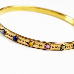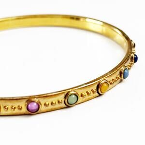 Gorgeous multicolored cabochon stones surround this gold-toned bangle bracelet. Marked LRL inside.