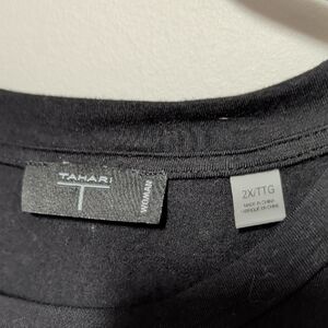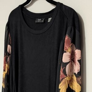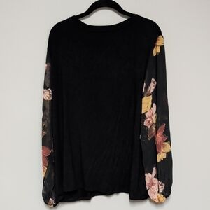 Chic black blouse featuring colorful floral sleeves. Ideal for versatile styling.