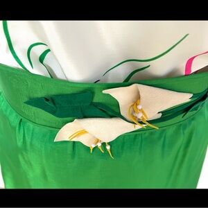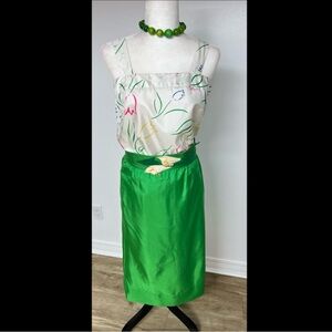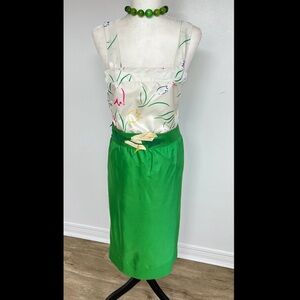 Vintage Green Satin Midi Skirt w Floral Top & Statement Belt – 60s Inspired