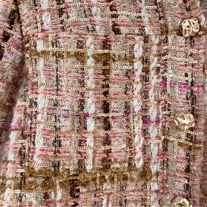 #AdrienneLandau #TweedJacket #SequinJacket #StatementBlazer #LuxuryStyle #Chanellnspired #EveningWear #HolidayOutfit #GlamLook #PoshStyle #WomensFashion #GoldAndPink #MediumSize #DesignerJacket