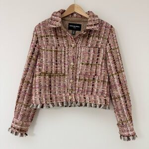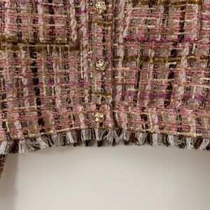Adrienne Landau Tweed Jacket Blazer in Pink, tan and brown plaid design with gold sequins and fringe trim.
