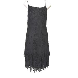 Keywords: beaded dress, black dress, evening gown, party dress, formal wear, flapper dress, art deco, sheer overlay, spaghetti straps, tiered hem, special occasion, glamorous, sophisticated