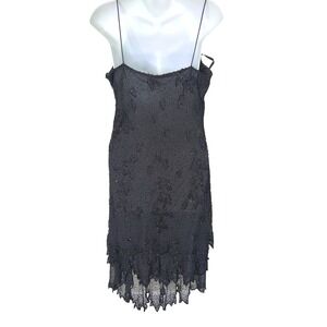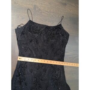 Elegant black beaded slip dress with a sheer overlay adorned with intricate beadwork and embellishments. Features delicate spaghetti straps and a tiered, scalloped hemline