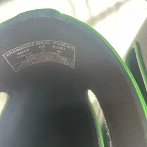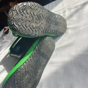 Durable and waterproof. Black boots with bright green trim. Ideal for wet weather.