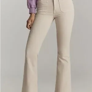 Chic high-rise flare jeans with patch pockets. Ideal for casual elegance.