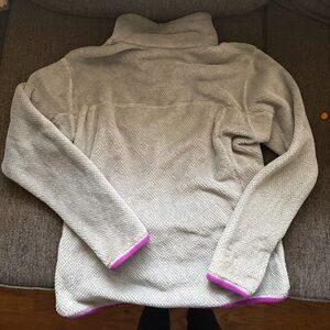 Cozy Patagonia sweater with a stylish cowl neck. Features a soft gray body and vibrant purple accents. Ideal for layering.