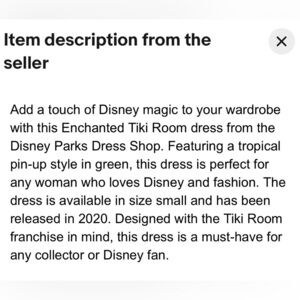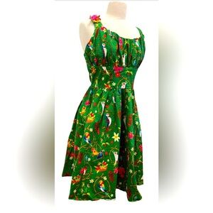Step into elegance with this Disney sundress, featuring a vibrant green hue and an asymmetrical tiered design. The sleeveless dress boasts a square neckline and a pleated, ruffled skirt, perfect for a wedding guest or cocktail occasion. Its playful style and bold color make it a standout choice for any event.( pit2pit 21” length from waste on down 24 1/2” approximately)Waist 18 1/‘ inches laying flat