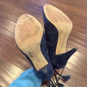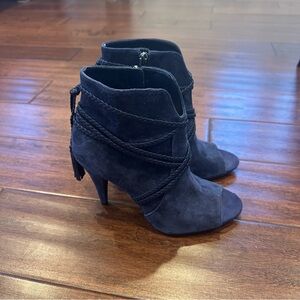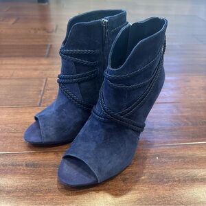 Vince Camuto Navy Suede Braided Tassel Peep Toe Booties