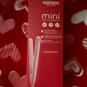 Charming pink bag with heart embellishments and 'love' detail. Includes a mini hair straightener and a heart-shaped makeup set. Face mask and purse