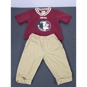 *** nice little set for their 1st game!! Thank you!!***The Vintage Florida State Jersey is a nostalgic piece perfect for fans of the Florida State Seminoles. This v-neck jersey features a big logo on the front, embodying the team's iconic look. The khaki pants accompanying the jersey add a subtle touch of Florida State's colors. This set is ideal for showing support for the team in style, whether worn to games or casually to display your team spirit.