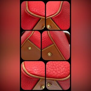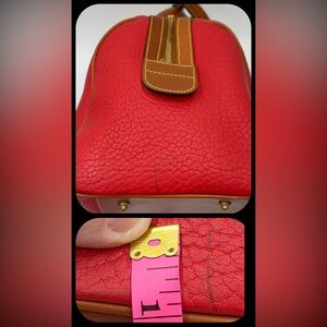Stylish red Dooney & Bourke speedy style satchel with brown leather handles. Front handle is slightly lighter (outside gets more light/sun). Features a detachable crossbody strap. Strap is NOT adjustable but it’s 44” long including the clips. You can wear this bag multiple ways - as a handheld or over the wrist/forearm satchel, or as a crossbody bag. Iconic Dooney & Bourke logo. Rich pebbled leather. If you’re familiar with this brand, you know just how durable their all weather leather (AWL) is. Please note: there ARE marks and scratches here and there and some fading/marks on interior lining from normal use, scuffed bottom corners, etc. There is a 1” long pen mark on the bottom of one side - I have not tried to clean it. I’d bet some leather conditioner and cleaner would do wonders! This bag is pre-loved but is fully functional and has many years left. There is an attached key strap inside so you’ll never have to dig for your keys. One zip pocket and a leather slip pocket in interior. Overall really nice vintage condition. No bad smells. Please see all pics for condition details and comment below with any questions. Cross-posted. Thanks for visiting & happy shopping! 🤗🛍️🤗