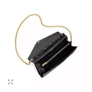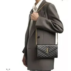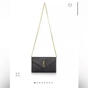 Chic black clutch with iconic gold YSL logo. Elegant gold chain strap. Perfect for evening wear.