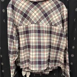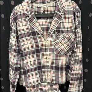 Cozy plaid pajama set. Features button-up top with pocket. Soft and comfortable fabric.
