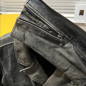 Sleek leather jacket with asymmetrical zipper. Features stylish lapels and zippered pockets.