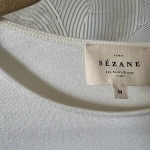 Stylish long sleeve top by Sezane. Features classic black stripes on a white background. Button detail on shoulder adds elegance.