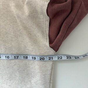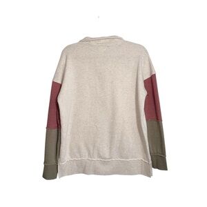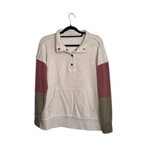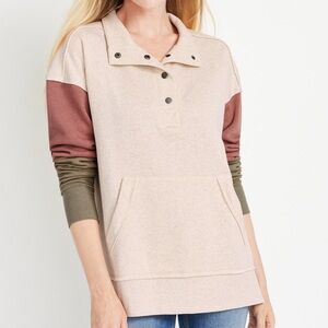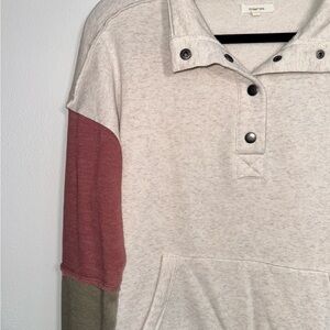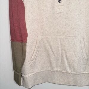 Maurices cream multi colorblock sleeve oversized sweatshirt. In excellent condition! Collared with snap button closure. Long sleeves. Mauve pink & olive green color blocking with frayed hems on sleeves. Single front pocket. Fleece lined. Oversized fit. Solid light cream color. Size medium.