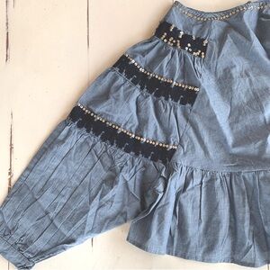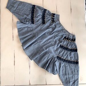 Swing Time Top Raga for Anthropologie; Chambray blue peplum top with brushed gold bead and sequin trim. Swing style peplum top, Round boat neck with sequin trim, Dolman style sleeves, Keyhole back closure cutout low back. Slightly oversized styling in an XS could easily work for a small if you want a less roomy look. A fun top for summer or spring break, beach vacation or summer grad parties. New with tags.