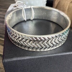 This stunning silver bangle features an intricate braided design, perfect for adding a touch of elegance to any outfit. Its sleek silver finish makes it a versatile accessory for any occasion.
