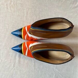 Bold color-blocking in brown, orange suede, blue, white, yellow, and black makes these boots a true statement piece. This is a discontinued and hard-to-find style, highly desirable for collectors and fashion lovers.