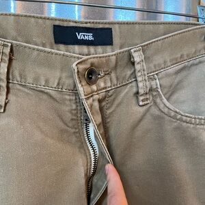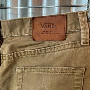 Classic Vans pants in a versatile tan shade. Ideal for everyday wear. Pre loved condition. Wallet mark on back pocket. Minor fold crease on bottom leg.